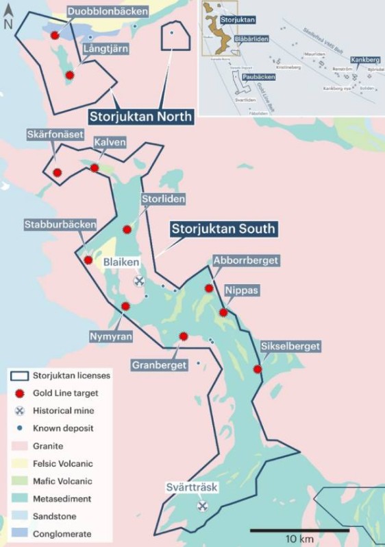 Historic work on the Storjuktan project consists limited amounts of mapping, boulder sampling, stream sediment and till sampling, top of bedrock drilling and diamond drilling. Historic operators have intersected gold mineralization at Duobblonbäcken, Långtjärn, Storliden, and Nippas targets. There is a high potential for expansion of known mineralization and new discoveries. Skärfonaset, Kalven, Stabburbäcken, Nymyran, Sikselberget are early-stage exploration targets that have clearly defined gold-in-till anomaliesGold Line Resources plans to follow up on this work with interpretation of magnetic data and systematic till and top of bedrock drilling along identified structural corridors to continue high priority target areas.